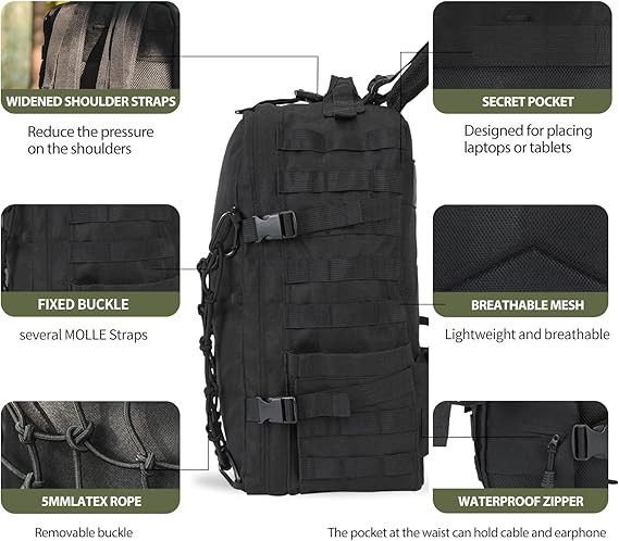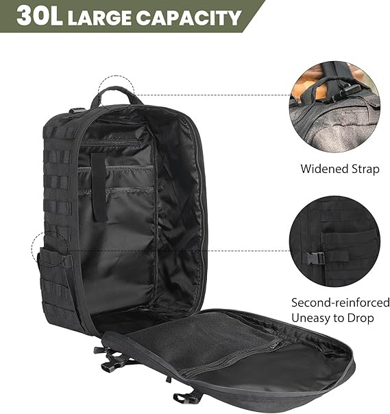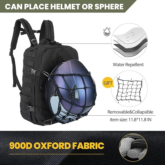 Esta mochila táctica para motociclistas, cuenta con gran capacidad (30L) y resistencia al agua. Su red elástica permite llevar un casco de moto (integral o medio), además de otros artículos. Cuenta con correas MOLLE, múltiples compartimentos, y materiales duraderos como tela Oxford 900D, ideal para viajes, camping y uso diario.